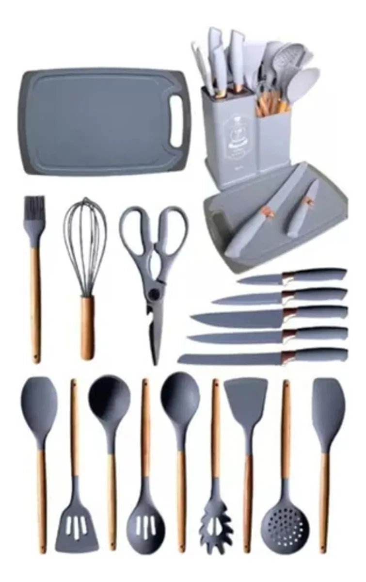 🍳 Kit Utensílios de Cozinha Completo – 19 Peças em Silicone + Facas Inox | Evrywealth